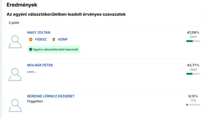 A manipuláció nem állt meg ennél. A harmadik helyen végzett, valóban függetlenként induló Béresné Lőrincz Erzsébet neve mellé is odakerült a „TISZA” felirat, ami tovább erősítette a félrevezető narratívát. Az eredeti, jelenleg is elérhető hivatalos adatok azonban egyértelműen cáfolják ezt az értelmezést.