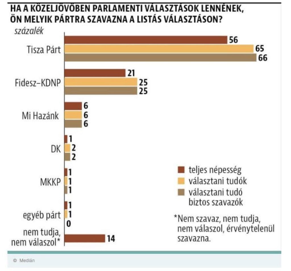 Medián: 18%-ot esett a Fidesz népszerűsége a választások óta, a Tiszáé már 56%-nál tart